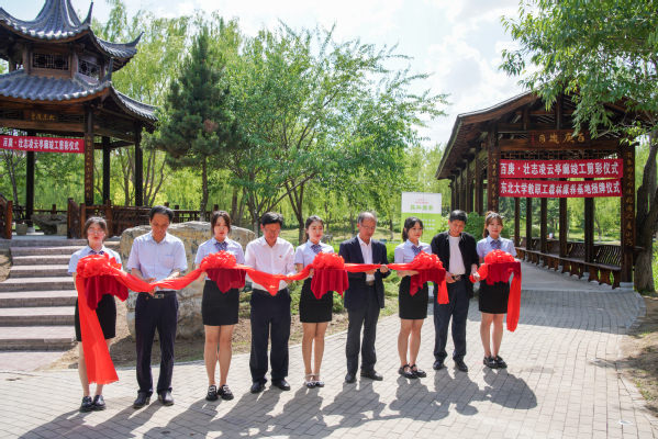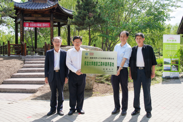 孙雷、庄志刚、雷龙与万建国共同为百庚·壮志凌云亭廊剪彩。孙雷为东北大学教职工森林康养基地授牌,并为庄志刚、雷龙、万建国颁发捐赠证书。