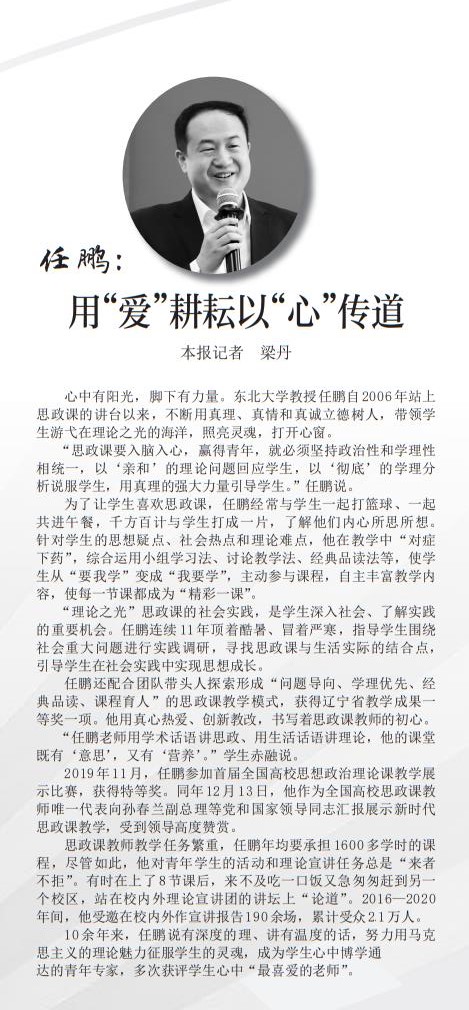 任鹏还配合团队带头人探索形成“问题导向、学理优先、经典品读、课程育人”的思政课教学模式,获得辽宁省教学成果一等奖一项。他用真心热爱、创新教改,书写着思政课教师的初心。