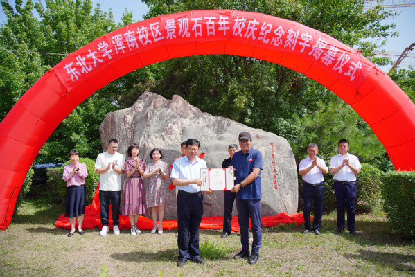 7月6日上午,东北大学浑南校区景观石百年校庆纪念刻字揭幕仪式举行。飞跃教育集团董事长臧海鹏校友、沈阳市美术家协会副主席吕洪臣、中国书法家协会会员万建国、沈阳市人民政府决策咨询委员会秘书长谢立萍、安利(中国)日用品有限公司辽宁分公司公共事务经理张丽、沈阳哲成艺术馆馆长姚宇瀚,副校长孙雷出席揭幕仪式。东北大学对外联络与合作处、浑南校区管委会、工商管理学院、软件学院等相关单位负责人与师生代表参加活动。