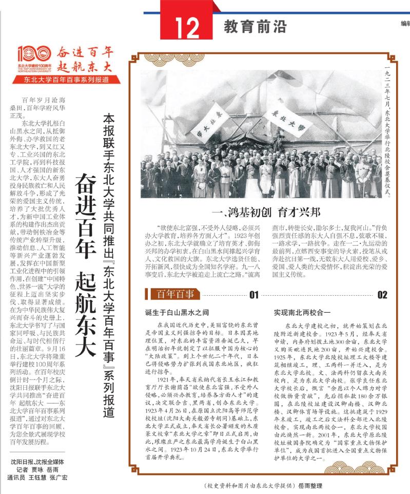 东北大学扎根白山黑水之间,从抵御外侮、办学救国的老东北大学,到又红又专、工业兴国的东北工学院,再到科技报国、人才强国的新东北大学,东大人奋勇投身民族救亡和人民解放斗争,形成了光荣的爱国主义传统,培养了大批优秀人才,为新中国工业体系的构建作出杰出贡献,带动钢铁冶金等传统产业转型升级,推动信息、人工智能等新兴产业蓬勃发展,发挥在中国新型工业化进程中的引领作用,在创建“中国特色、世界一流”大学的征程上迈出坚实步伐、取得显著成绩。在为中华民族伟大复兴而奋斗的史册上,东北大学书写了与国家同呼吸、与民族共命运、与时代相偕行的壮丽篇章。9月16日,东北大学将隆重举行建校100周年系列活动。在百年校庆倒计时一个月之际,沈阳日报联手东北大学共同推出“奋进百年起航东大——东北大学百年百事系列报道”,通过对东北大学百年百事的回顾,为您全景式展现学校百年发展历程。