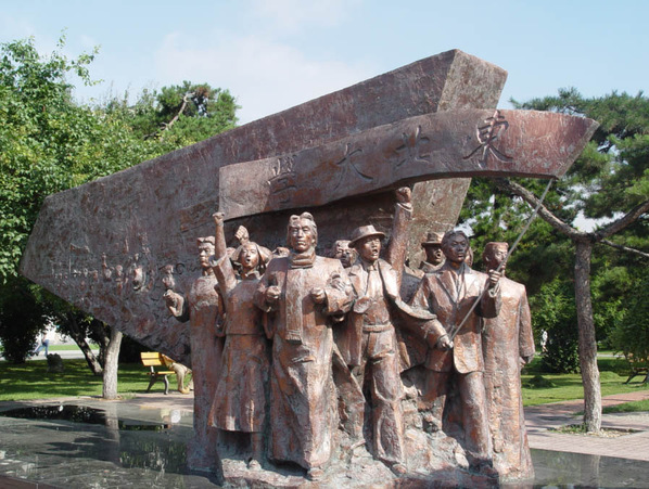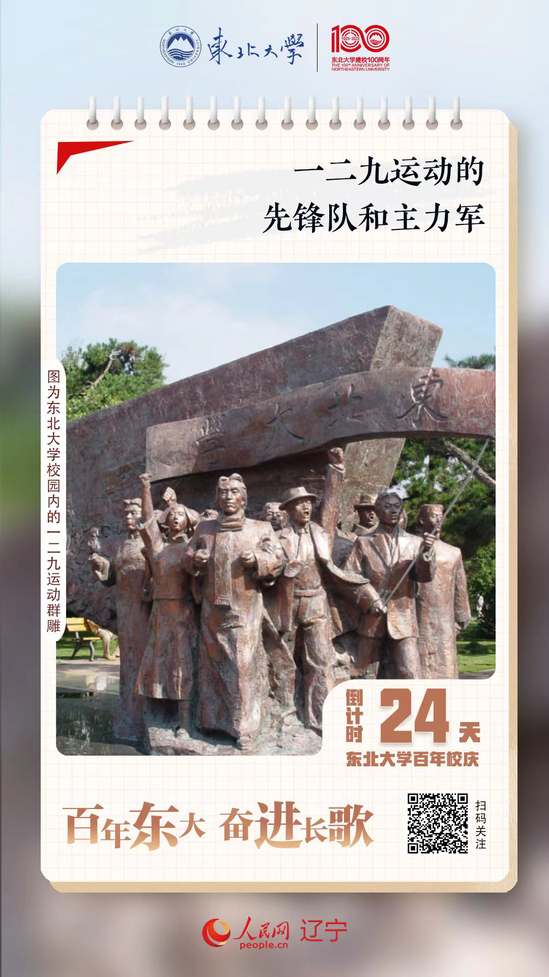 步入东北大学南湖校区一舍、二舍之间的“一二九”花园,一座伫立在花园中央的古铜色群雕总能吸引人们的目光:前仆后继的青年学子顶着寒风,高举校旗,手挽着手肩并着肩,大踏步地走在游行队伍的最前列。刚毅的轮廓、坚定的眼神、激情的手势,一个个生动的人物形象呼之欲出,将人们的思绪拉回到那个动荡不安、颠沛流离的年代。