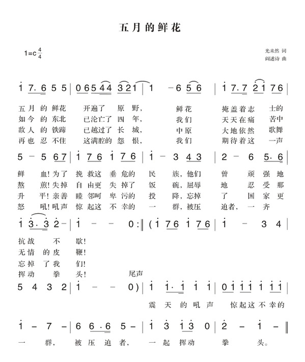 阎述诗本人是从东北流亡到北平来的。他在顷刻之间,就对歌词中所说的“再也忍不住满腔的悲愤,我们期待着这一声怒吼”迸发出强烈的共鸣。随着感情的升华,他很快构思好了音乐的主题,纵笔谱写完了金曲。后来,独幕剧《阿银姑娘》由拓荒剧团在武汉公演,《五月的鲜花》便作为救亡名曲,乘着歌声的翅膀飞荡于抗战救亡前哨。
