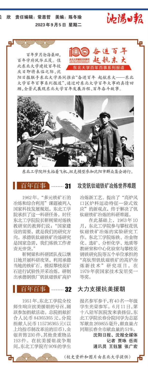 百年岁月沧海桑田,百年学府风华正茂。值此东北大学建校百年校庆日即将来临之际,沈阳日报联手东北大学共同推出“奋进百年 起航东大——东北大学百年百事系列报道”,通过对东北大学百年大事的真情回顾,全景式展现东北大学百年发展历程、百年奋斗故事。