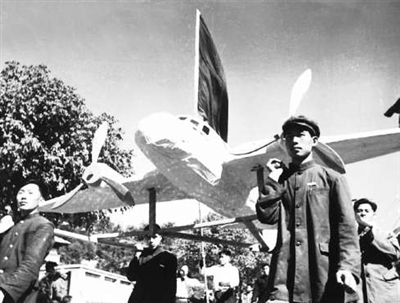 东北工学院师生抬着飞机、坦克模型参加沈阳市群众集会游行。