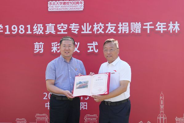 9月15日,东北大学1981级真空专业校友捐赠千年林剪彩仪式在南湖校区举行。东北大学党委副书记、纪委书记吴豪伟,1981级真空专业校友王志全、尹东国、方立武、周红军、张孝邦、刘严、季天富等校友代表,真空专业老教授代表、往届真空校友、学院师生代表等出席剪彩仪式。