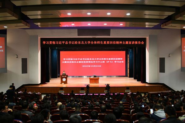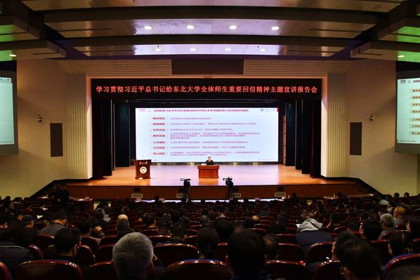 10月24日下午,学习贯彻习近平总书记给东北大学全体师生重要回信精神主题宣讲报告会暨校党委理论学习中心组(扩大)学习会议在汉卿会堂蔡冠深报告厅举行。校党委书记郭海作主题宣讲,校长冯夏庭主持报告会。